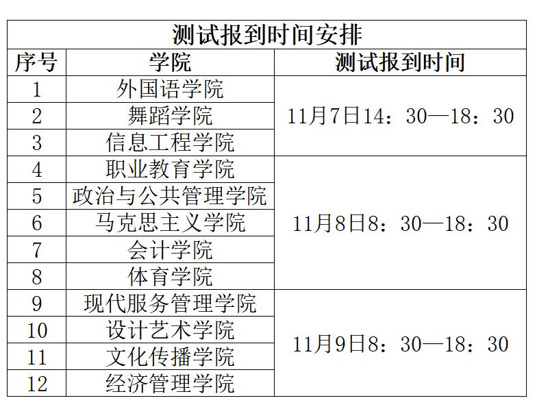 测试时间自2025年11月7日—9日,各学院按测试时间安排进行考试,测试地点在躬行楼,报到时间以准考证信息为准,具体时间如下(若考试时间因故推迟,以后续通知时间为准):